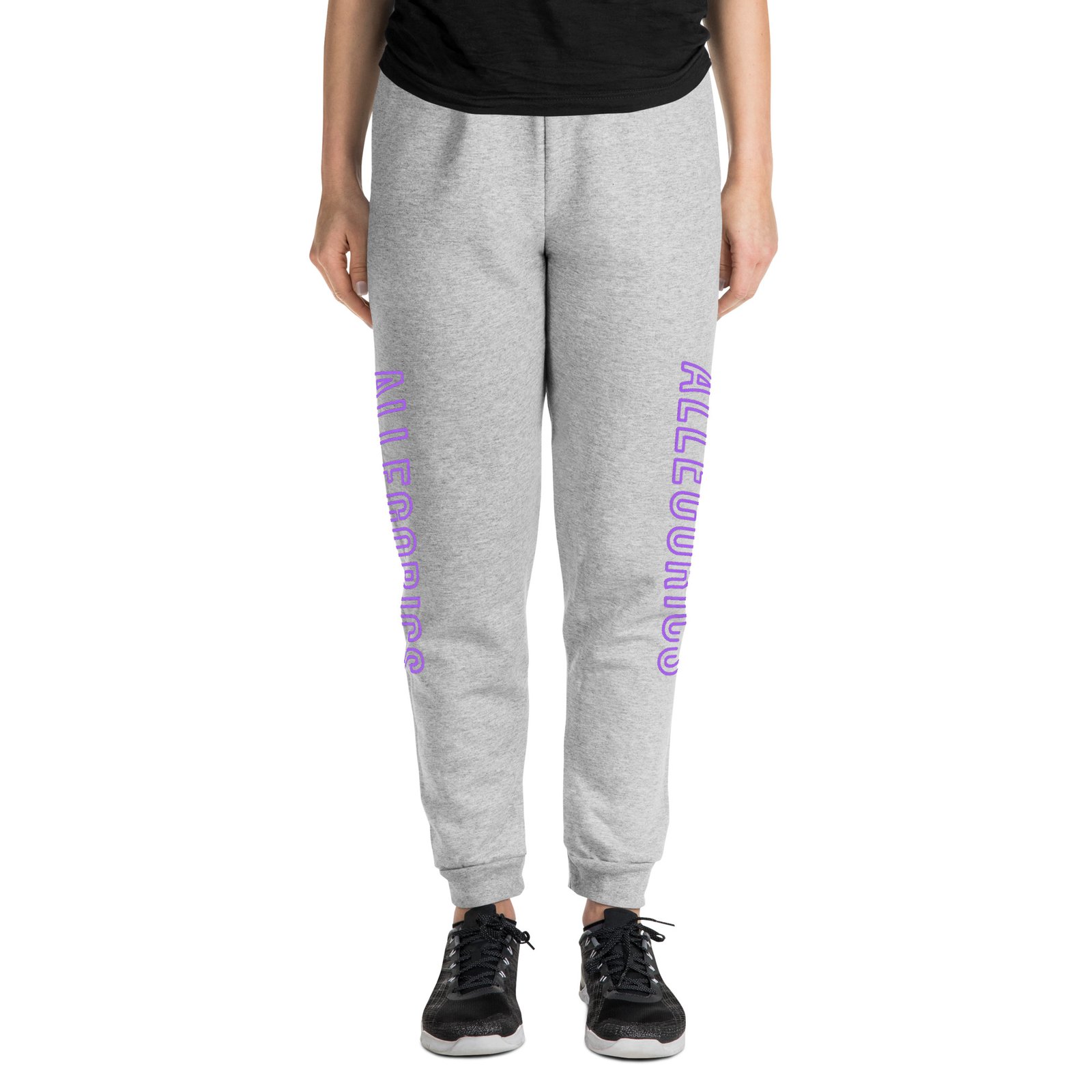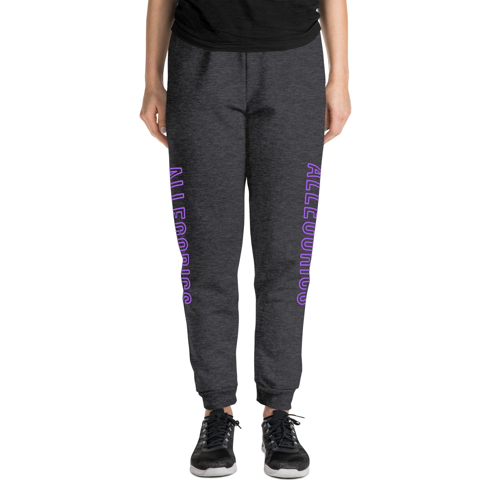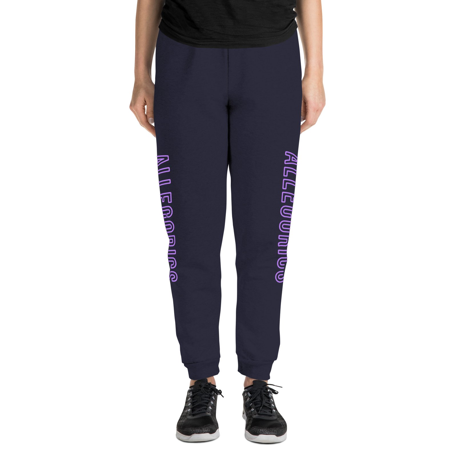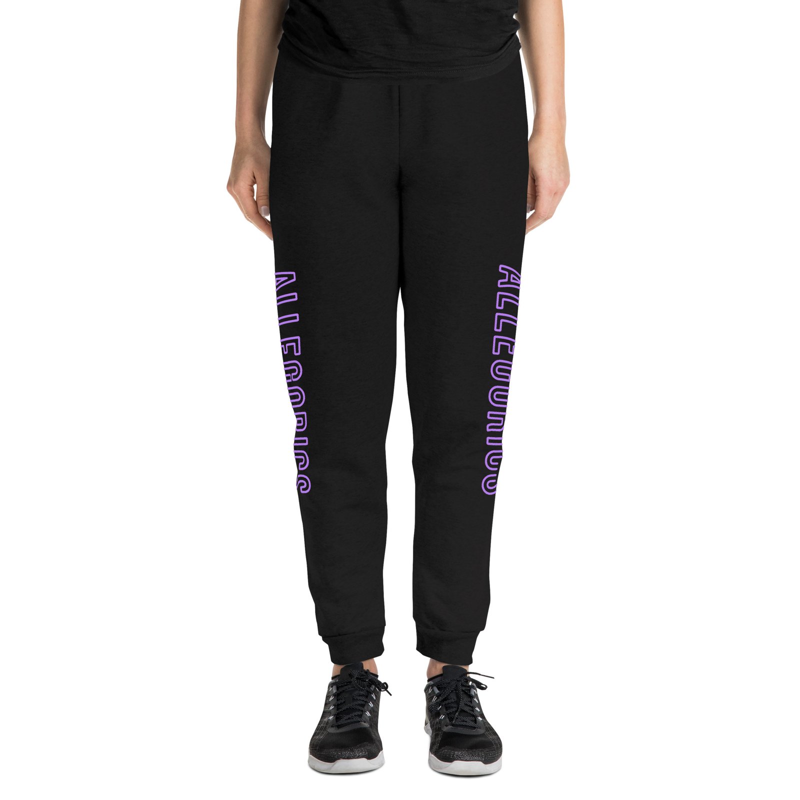 • DTG-printed neon purple/pink “ALLEGORICS” design on right leg