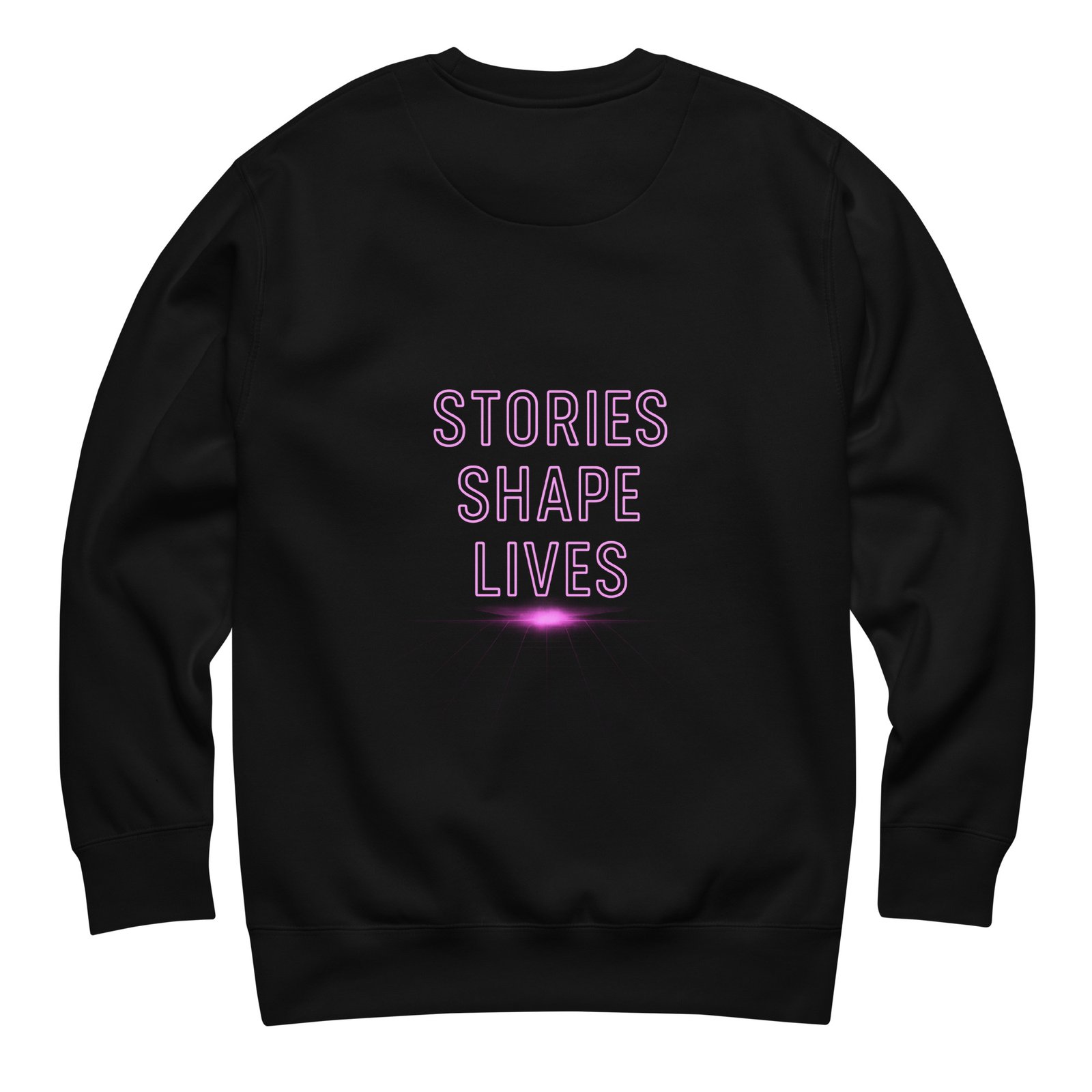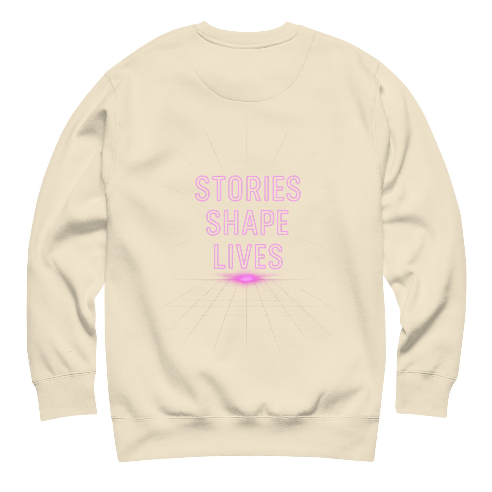 Back: bold DTG print “STORIES SHAPE LIVES” in neon pink or neon purple