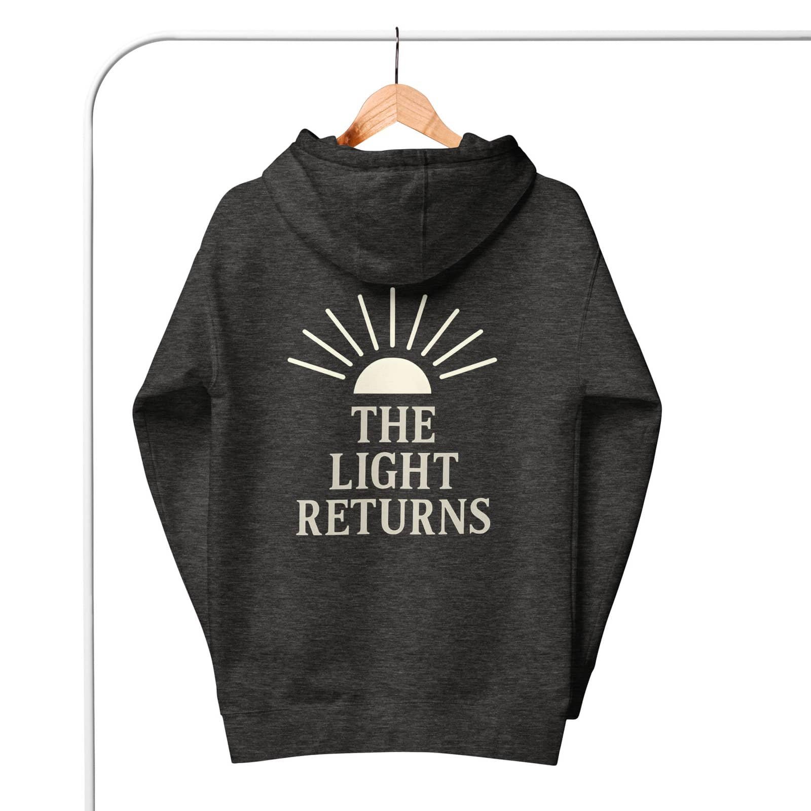 • DTG printed back design: “THE LIGHT RETURNS” with rising sun clipart
